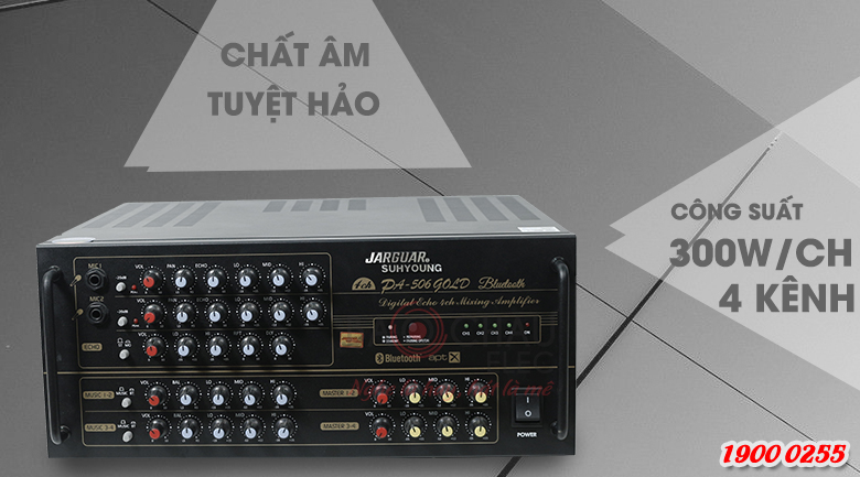 Amply Jarguar PA-506 Gold Bluetooth trang bị mạch Analog cho công suất lớn 1200W/4 kênh nên có thể kéo 2 đôi loa bass 25cm cho chất âm thanh tuyệt phù hợp cho phòng từ 25 – 30m2.